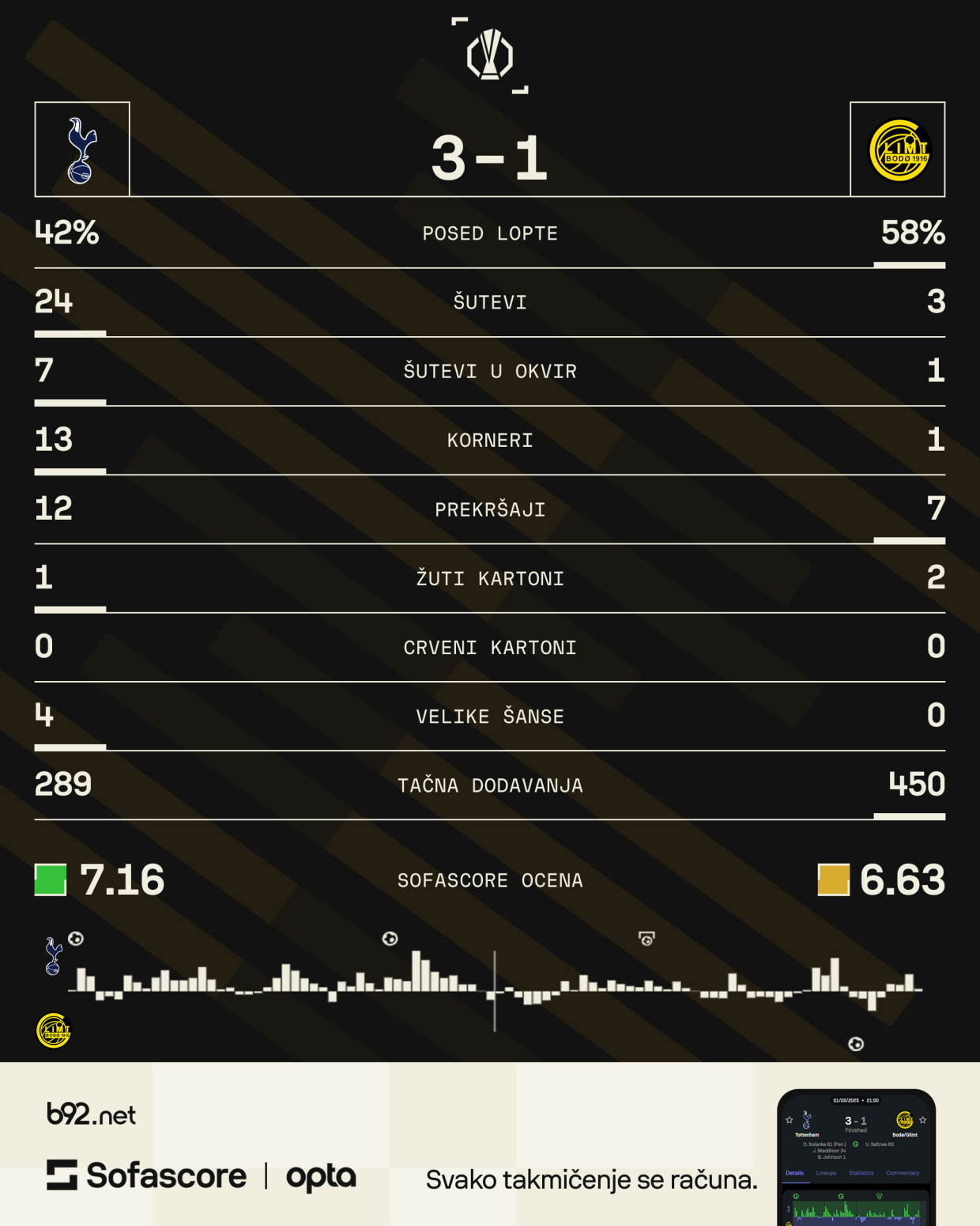U isto vreme, Totenhem je bio vrlo dominantan i siguran protiv Bodo/Glimta, koga je načeo već u prvom napadu.