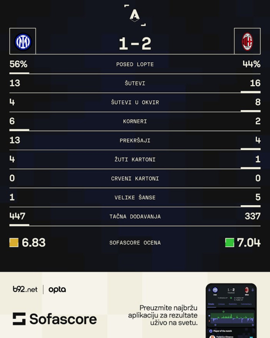 Junak meča je na kraju Matija Gabija, koji je pogodio u 89. minutu i tako je doneo veliku pobedu za Milan, koji se tako vratio na pobednički kolesek.