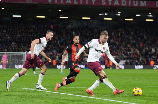 Umalo da četiri minuta kasnije Džered Bouven kazni ekipu Bornumta za propuštenu šansu, ali je igrač Vest Hema pogodio prečku.