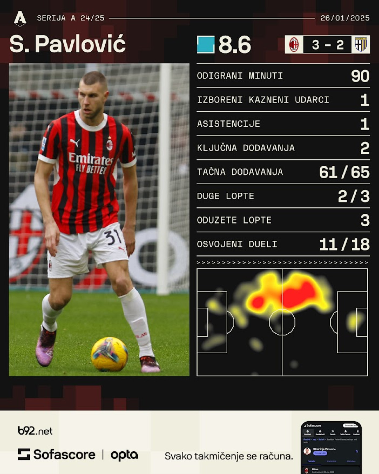 Prvi put posle skoro dva meseca za "rosonere" je u italijanskom prvenstvu igrao i naš Strahinja Pavlović, koji je upisao i ključnu asistenciju, te bio najbolji igrač meča.