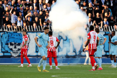Bakljada u plavo-beloj boji napravila je dimnu zavesu, zbog koje je arbitar Nenad Minaković rešio da zaustavi igru.