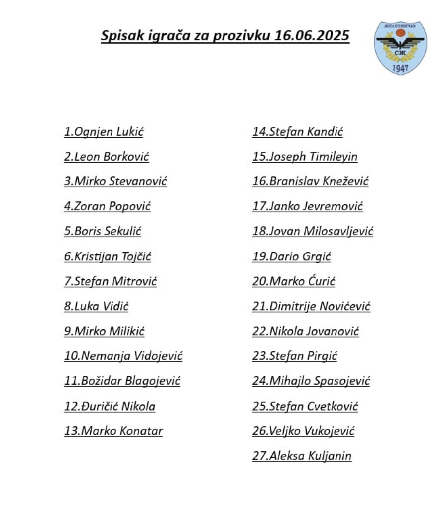 Prozivci je prisustvovalo 27 fudbalera, među kojima su bili i novi članovi tima Kristijan Tojčić, Stefan Mitrović i Aleksa Kuljanin, kao i standardni prvotimci iz prethodne sezone.