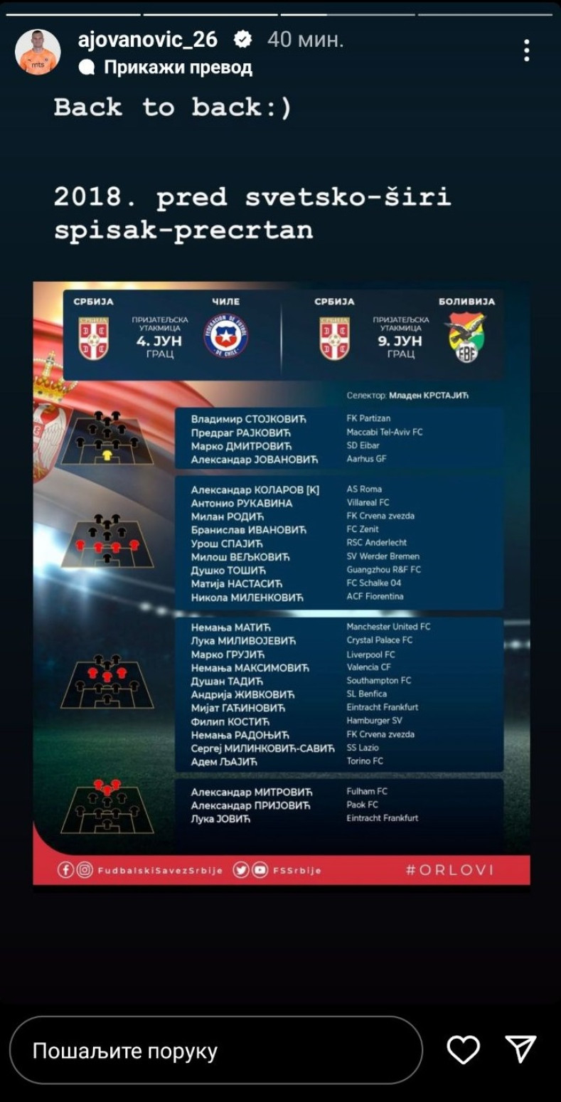 Zanimljivo, isti scenario je doživeo i 2018. godine, kada je bio na spisku tada selektora Slavoljuba Muslina, bio je član ekipe na 10 utakmica kvalifikacija, ali nije bio među putnicima na Svetsko prvenstvo.
