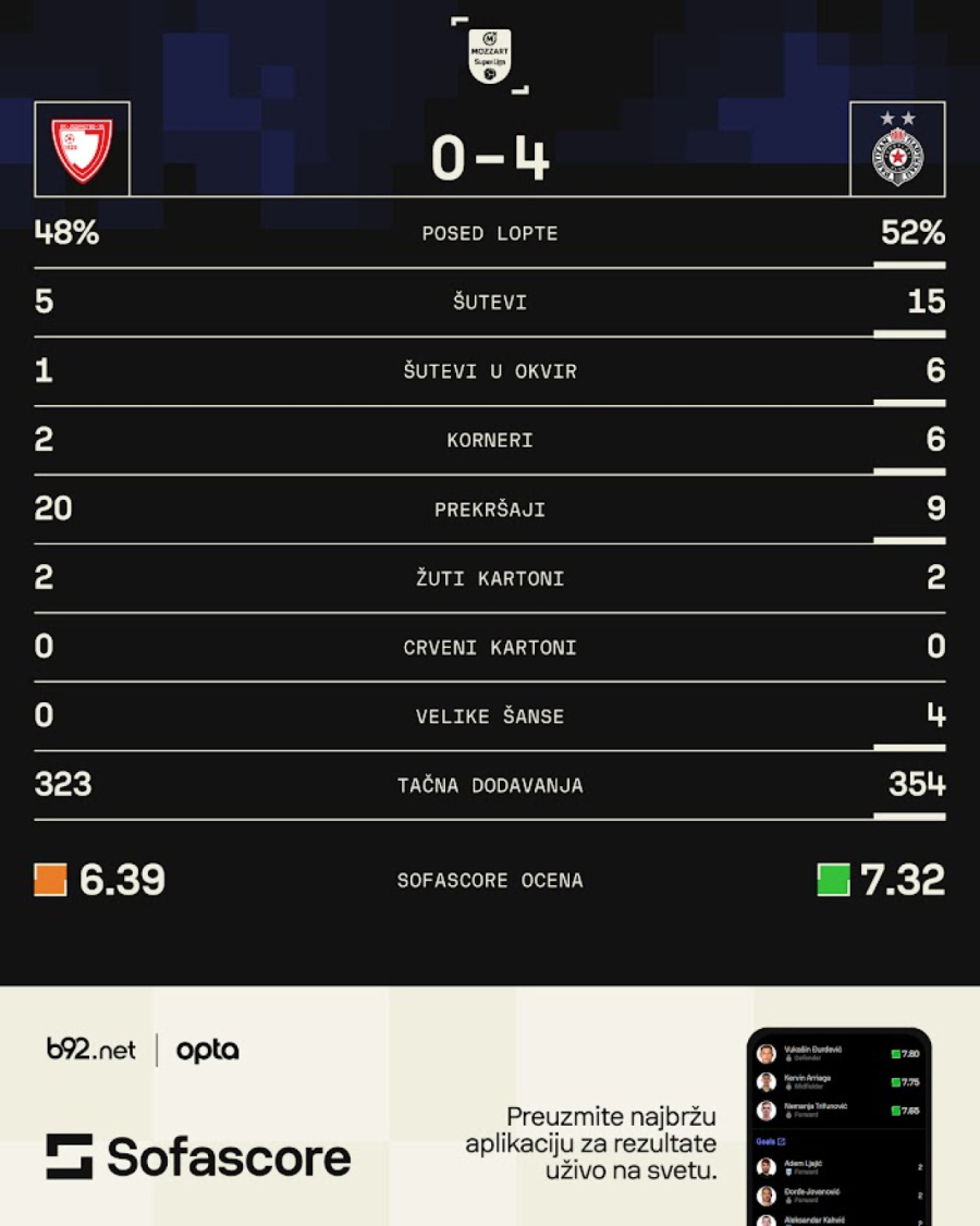 Za Partizan su na ovom meču pogađali Natho u trećem sa bele tačke, potom Nemanja Trifunović u 28, da bi u drugom poluvremenu oba gola postigao Đorđe Jovanović.