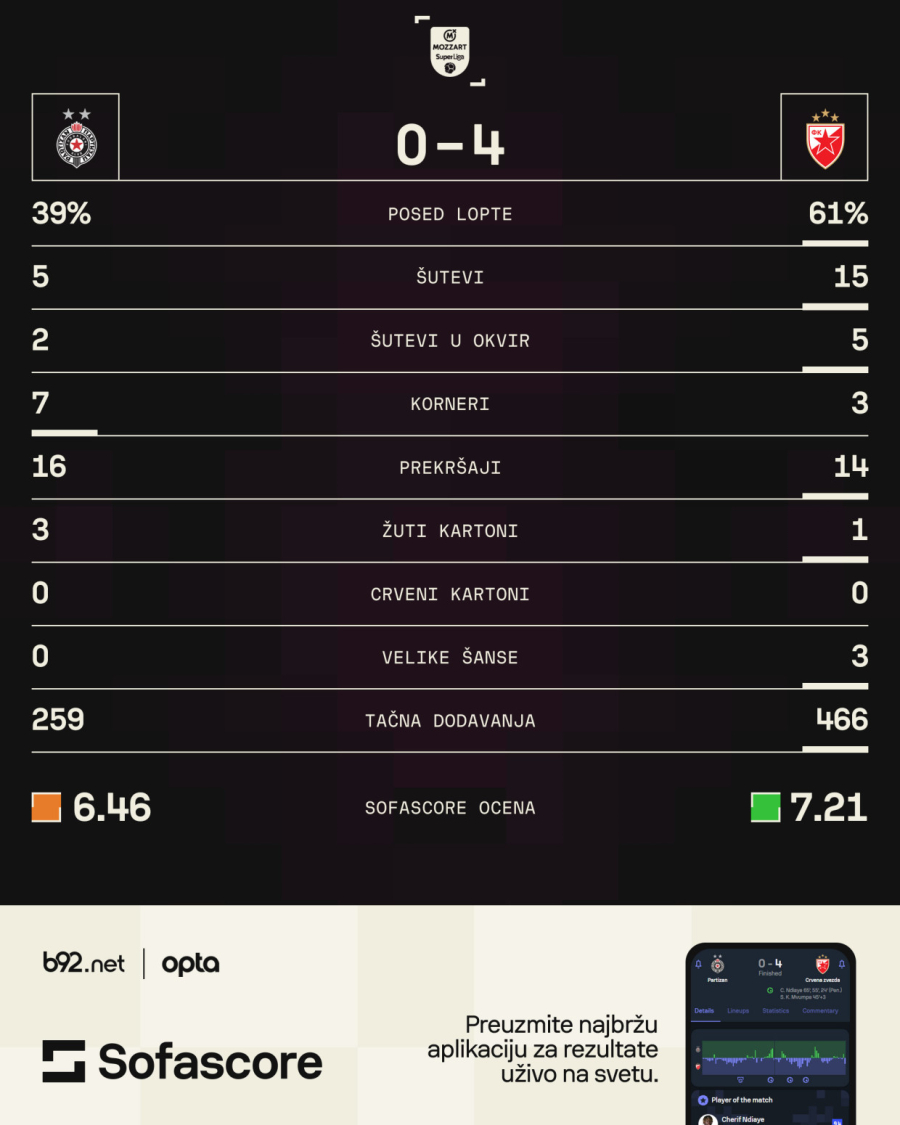 Crveno-beli su upisali prvu trijumf u Humskoj od 2016. godine, ali su 11 uzastopnih neuspeha dobrano nadoknadili – najubedljivijom pobedom ikada na stadionu najvećeg rivala.