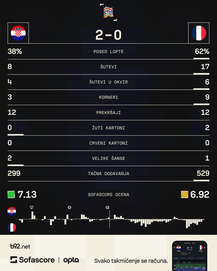 Francuska poslednji put nije dala gol još 14. novembra protiv Izraela kada je bilo 0:0, a prvi put je izgubila od Hrvatske tek u ovom duelu Lige nacija.