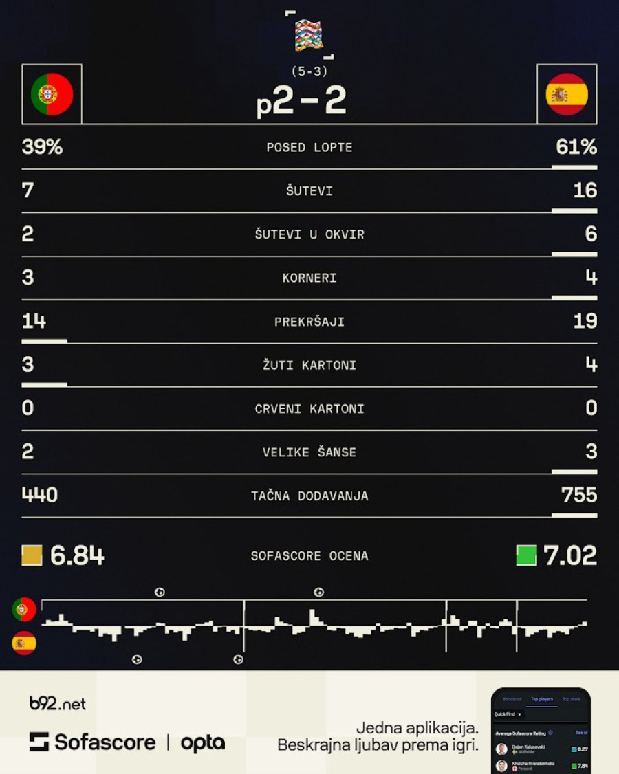 Portugalci su bili nepogrešivi u izvođenju jedanesteraca, svih pet puta su bili precizni, dok je Alvaro Morata jedini bio neprecizan i tako je rezultatom 5:3, ekipa Roberta Martinesa odnela pobedu i pehar Lige nacija.