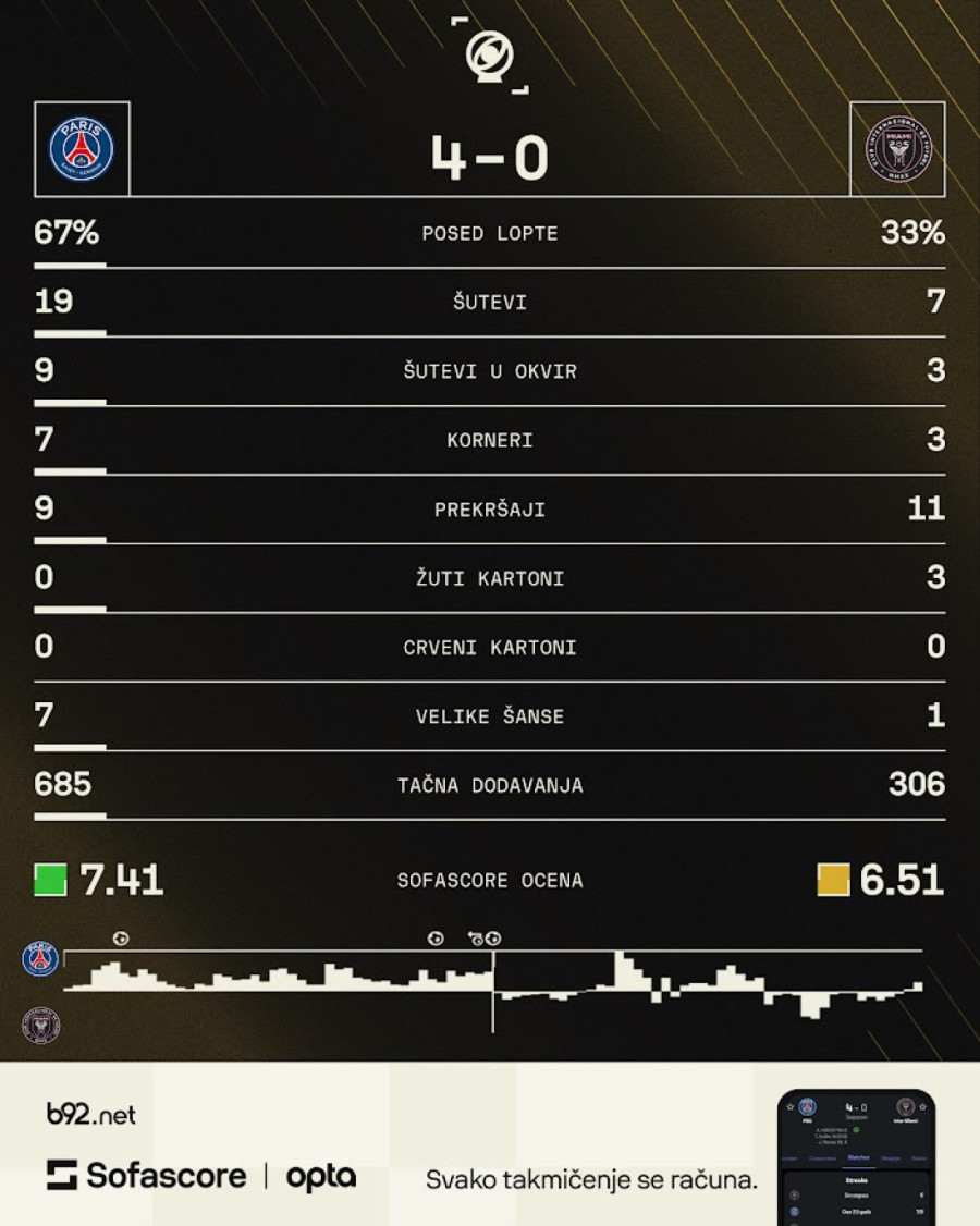 Tako je aktuelni prvak Evrope, posle još jednog gola Žoaa Neveša i posle autogoloa Avile, da bi poslednji udarac zadao Hakimi u samoj nadoknadi za potpunu katastrofu Mesijevog tima.