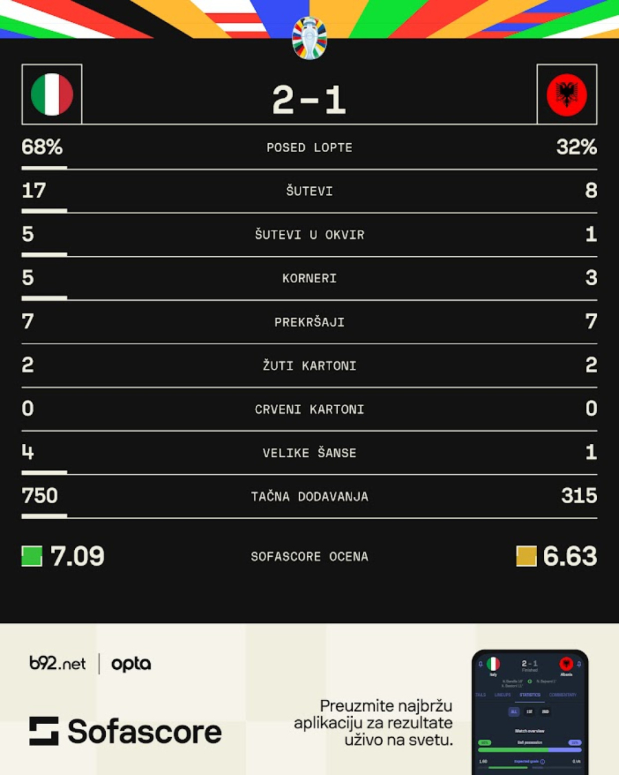 Do kraja meča Albanija je mogla do izjednačenja. Veliku šansu za bod na startu Evropskog prvenstva je imao Rej Manaj, ali je njegov pokušaj zaustavio Đanluiđi Donaruma.