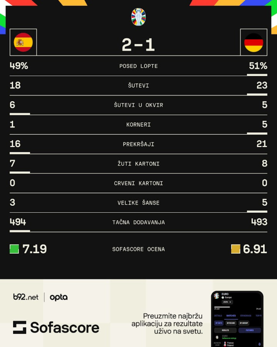 Prethodno, Olmo je doveo Špance do vođstva, Nemci su potom uraganski napali, ređali šanse, pogodili stativu, da bi preko Virca u 88. minutu došli do zasluženog izjednačenja.