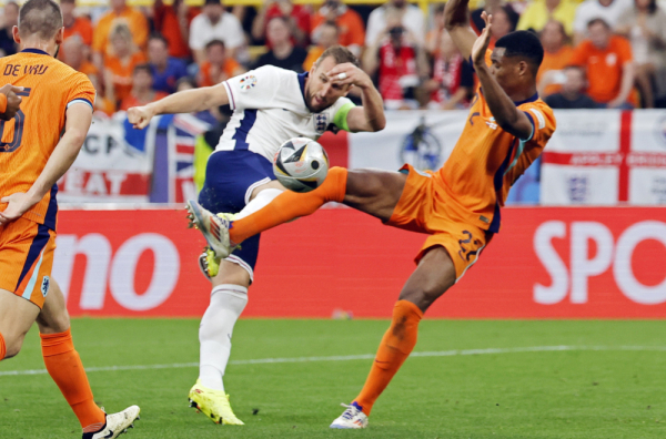 Kejn je pokušao da uputi udarac ka golu Holandije, a Damfris je podigao nogu kako bi ga izblokirao.