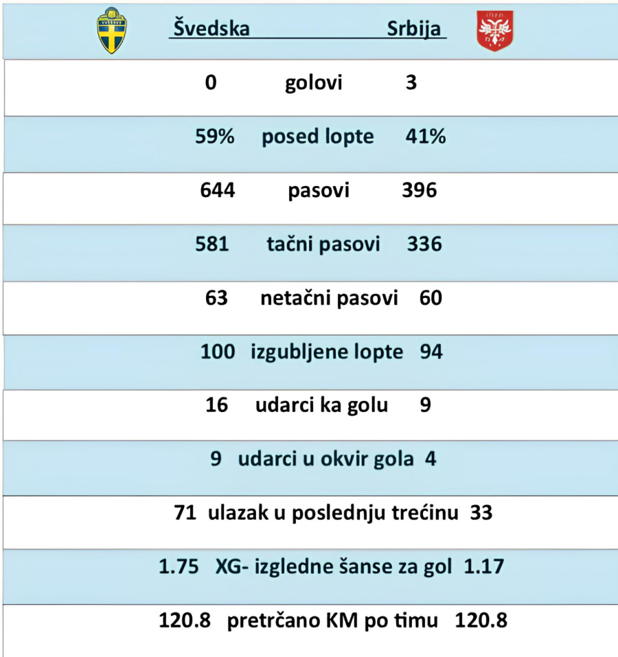 U gore navedenim statističkim parametrima možemo videti da smo imali više od 200 tačnih pasova u odnosu na protivnika, zatim 134 ulaska u poslednju trećinu protivnika naspram njihovih 75, odnosno 62 pasa naspram 30 u poslednjoj trećini, čak 31 u odnosu na 21 završni pas u ovoj zoni kao i 33 centaršuta u odnosu na njihovih 19.
