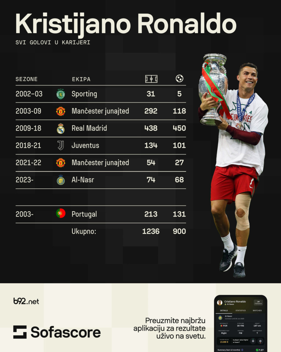 To je bio njegov 131. gol za Portugal, a na klupskom nivou bio je strelac za Sporting, Mančester junajted, Real Madrid, Juventus i Al Nasr, za koji sada igra.