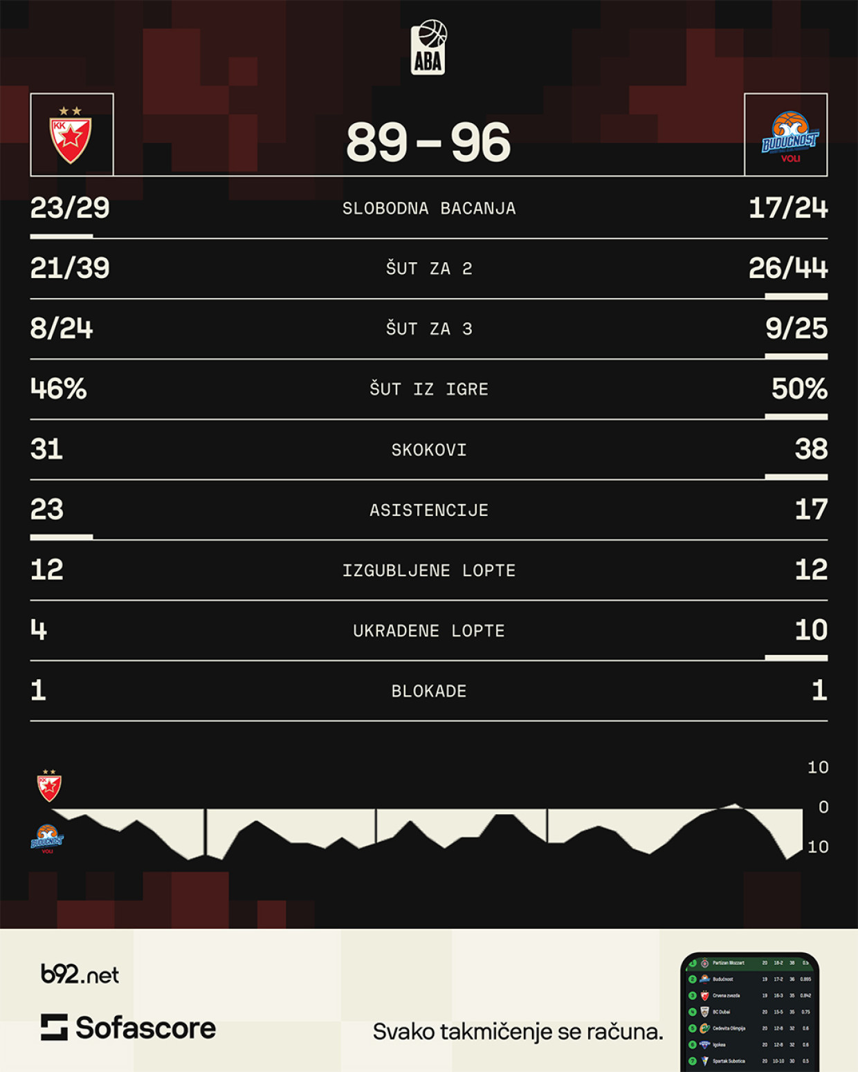 Crveno-beli se nalaze na trećem mestu ABA lige sa 16 pobeda i četiri poraza, dok je Budućnost druga sa skorom 18-2, koliko ima i prvoplasirani Partizan.