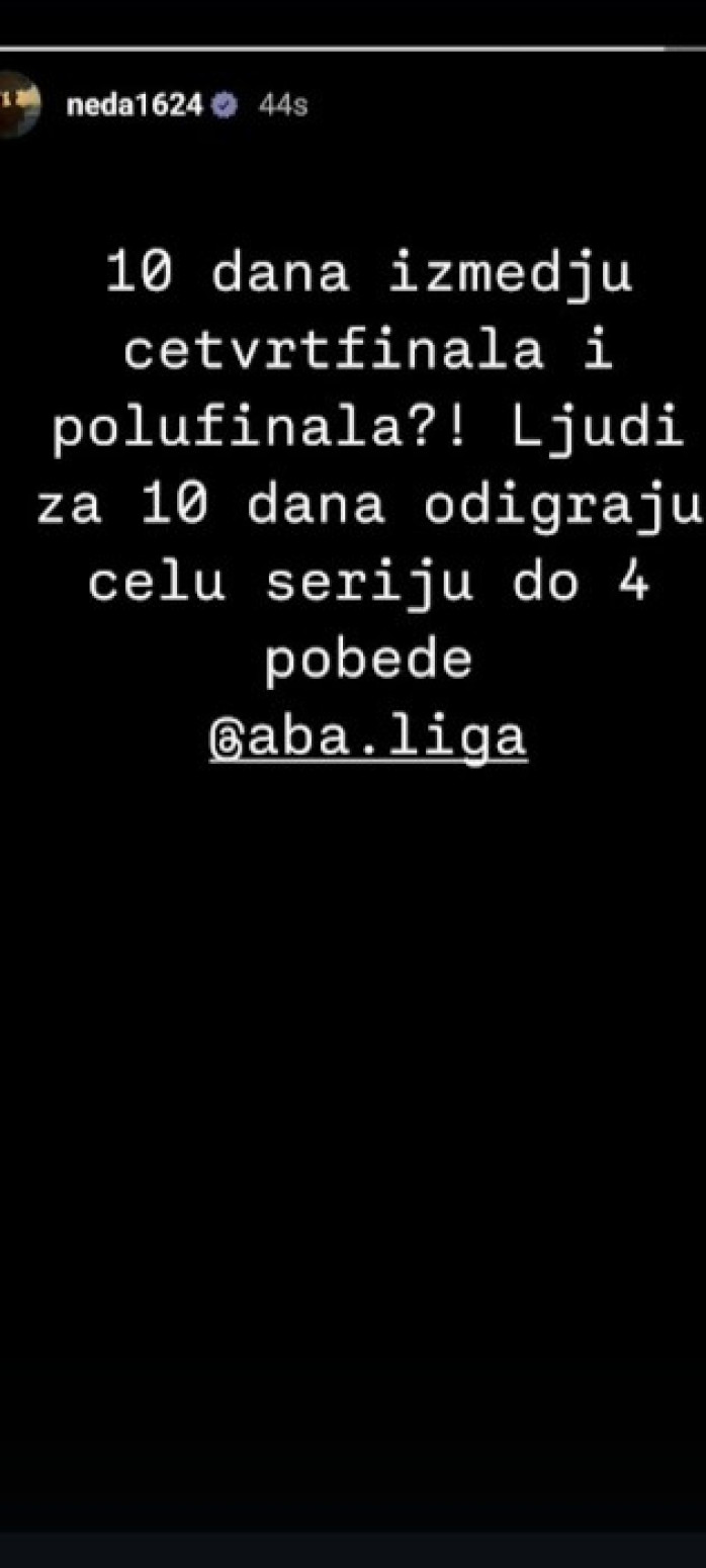 "Deset dana između četvrtfinala i polufinala? Ljudi za deset dana odigraju celu seriju od četiri pobede", napisao je Nedović i "tagovao" ABA ligu.