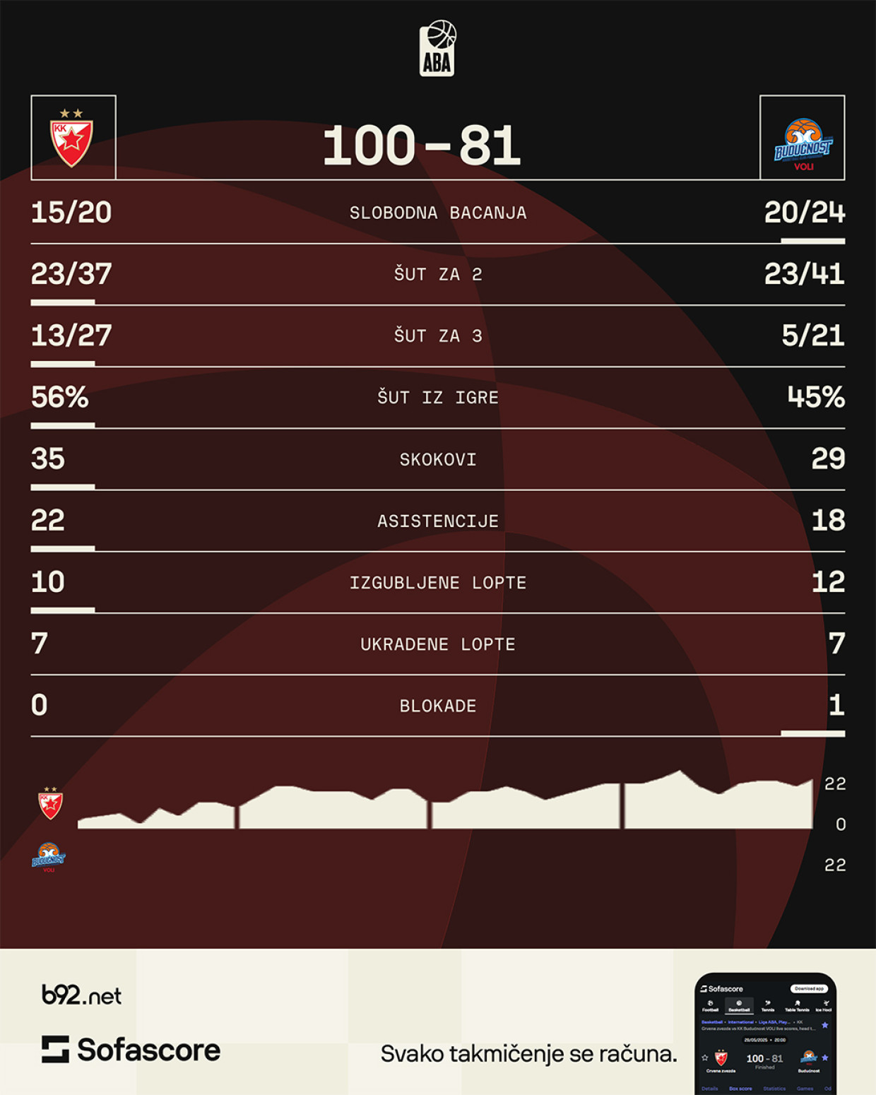 Crveno-beli su serijom 6:0 otvorili drugu četvrtinu i došli do velikih +14 (31:17). Nedović je pogodio četiri penala, jedno je pogodio za tehničku koju je zaradio Andrej Žakelj, a potom je fauliran pri šutu za tri poena.