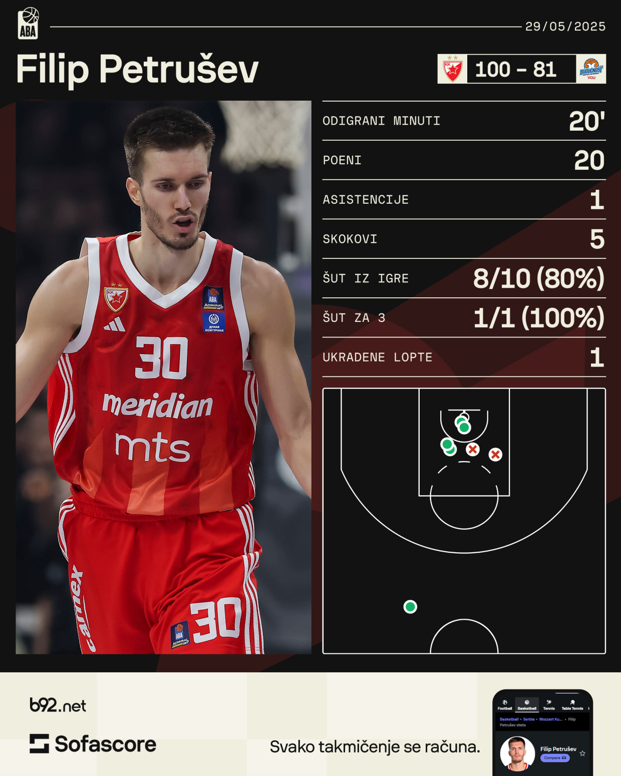 Crveno-bele je do pobede predvodio Filip Petrušev sa 20 poena i pet skokova, pratili su ga Ajzea Kenan, Ognjen Dobrić i Nemanja Nedović sa po 13 poena.