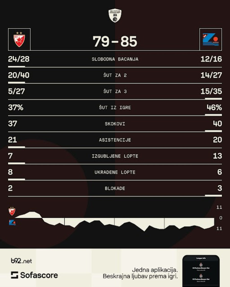 Zadar je imao izvanredno šutersko veče pogodio je 15 trojki iz 35 pokušaja (42%), dok Crvenu zvezdu šut spolja nije služio: pogodila je svega pet trojki iz 27 pokušaja, odnosno 18%.