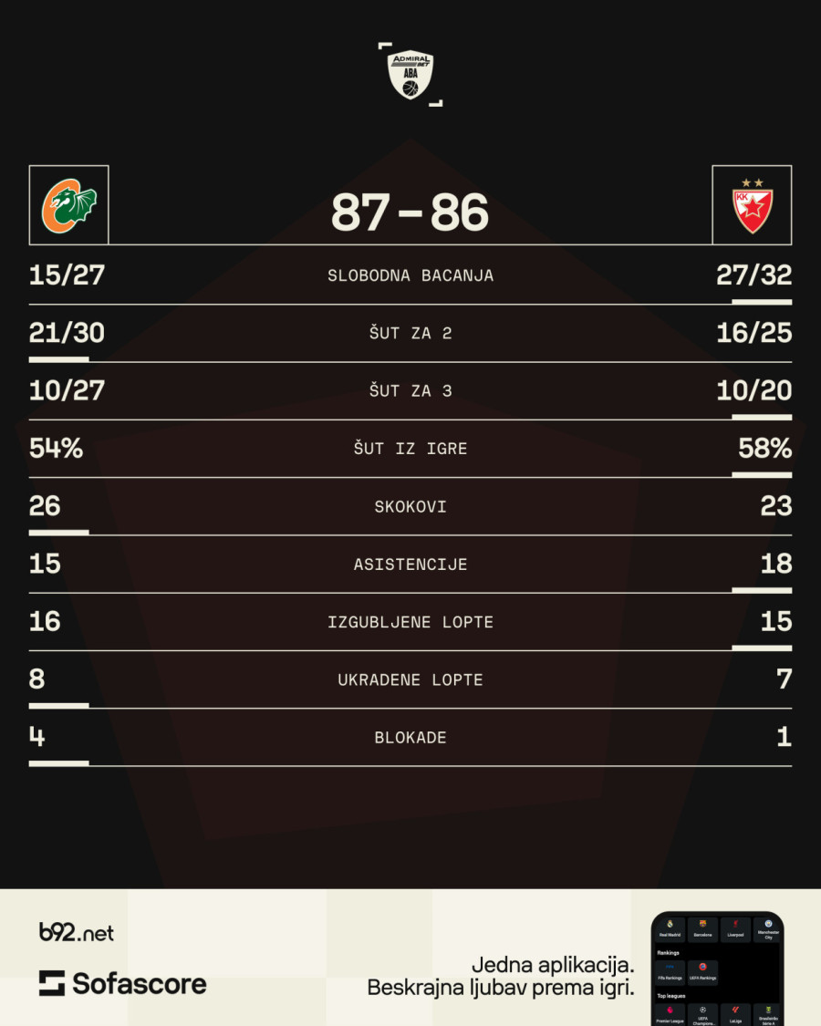 Cedevita Olimpija – Crvena zvezda 87:86 (23:16, 25:28, 17:22, 22:20) Hala: Stožice (Ljubljana) Sudije: Tomislav Hordov, Josip Radojković, Marko Mustapić