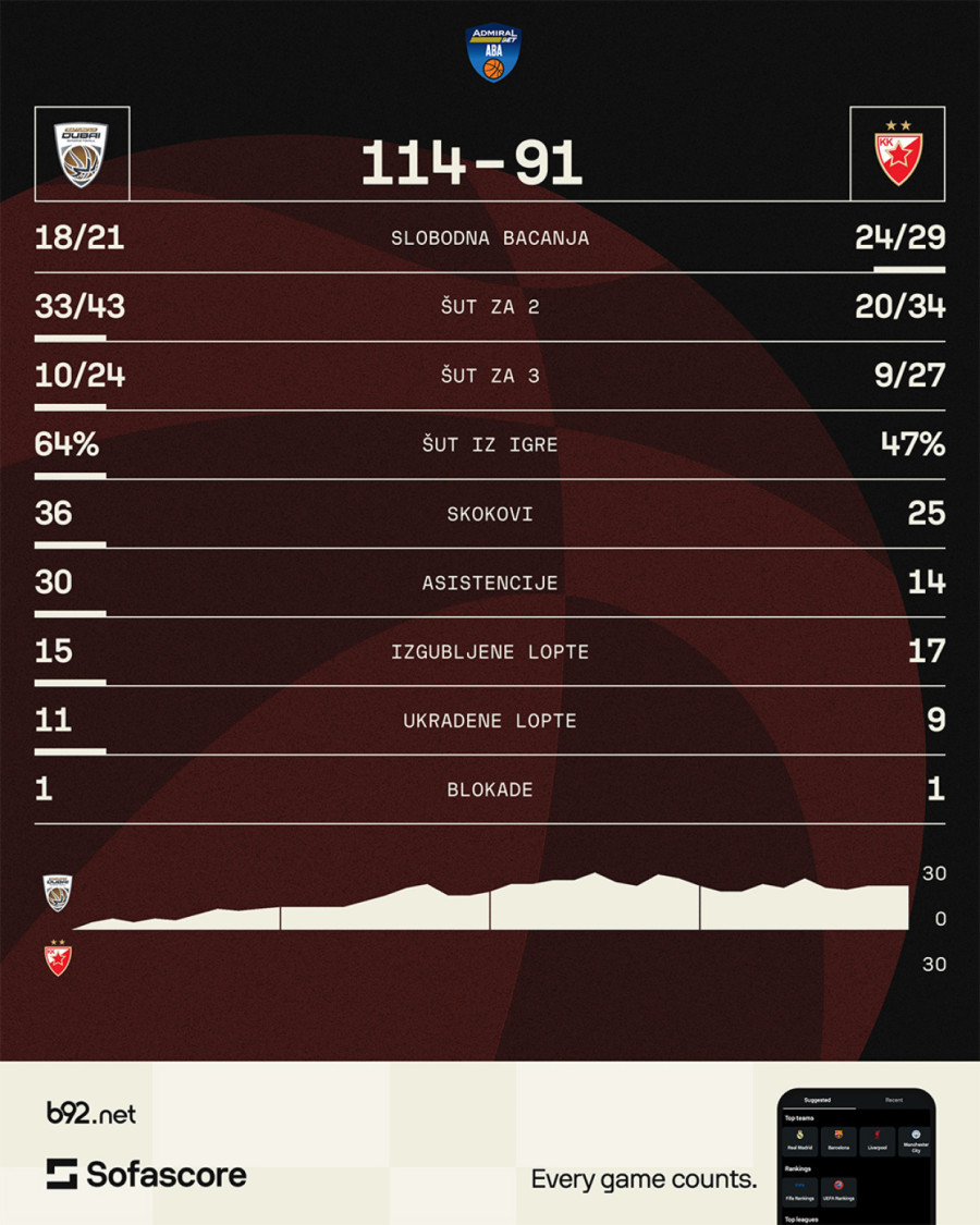 Dvocifreni su bili još Mfiondu Kabengele sa 15, Kosta Kondić sa 14, Filip Petrušev sa 13 i Davis Bertans sa 11 poena.