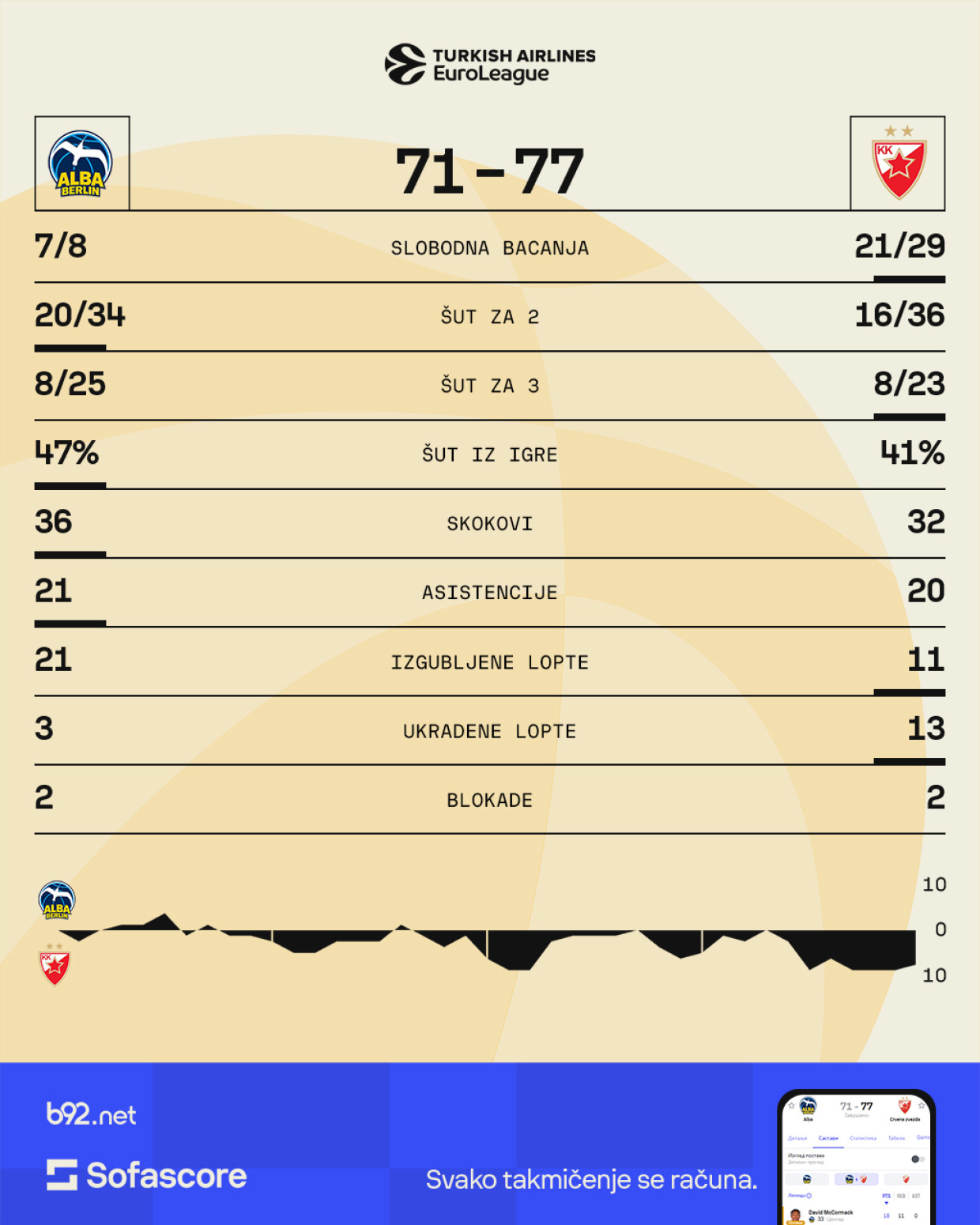 Dobrić je u nastavku pogodio trojku, bili su egalu crveno-beli i tim iz Berlina, a onda je Zvezda napravila seriju 7:0 i ponovo vratila prednost. Na kraju je Spanjolo pogodio trojku za -4 Albe (55:59).