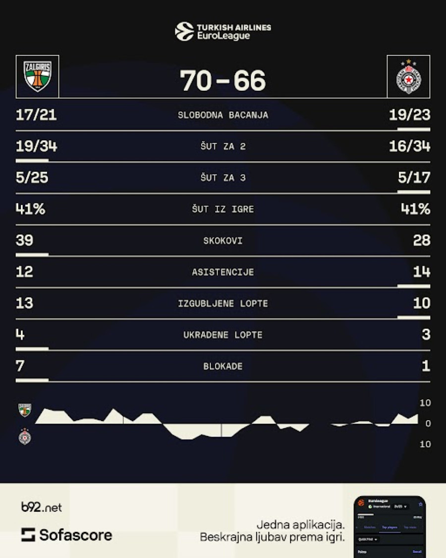 Košarkaši Partizana izgubili su u Kaunasu od Žalgirisa 66:70 (21:24, 19:11, 9:14, 17:21), u utakmici pretposlednjeg 33. kola Evrolige i izgubili šanse da se plasiraju u plej-in.