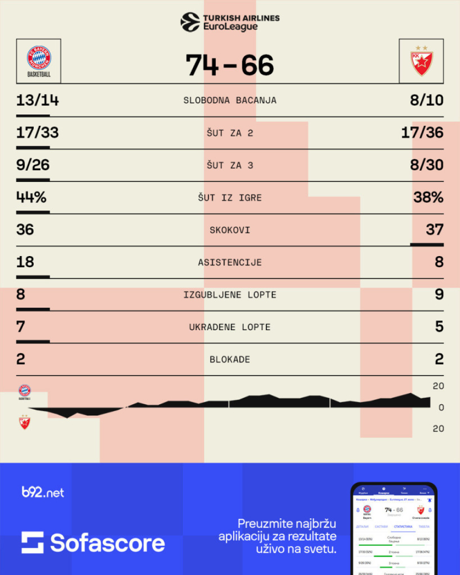 Bajern Minhen – Crvena zvezda 74:66 (20:19, 12:8, 21:19, 21:20) Hala; BMW Park (Minhen) Sudije:Migel Anhel Peres (Španija), Joanis Fufis (Grčka), Robert Viklicki (Češka)