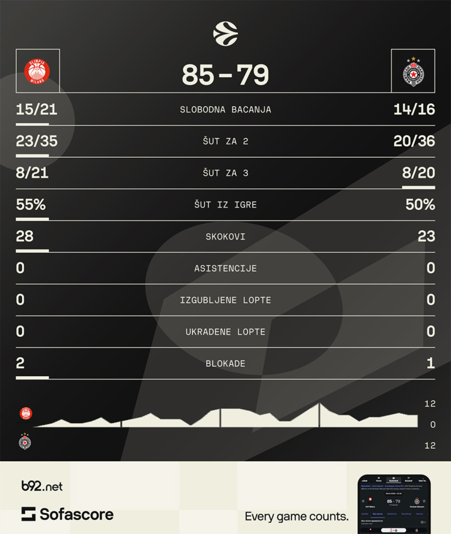 Košarkaši Partizana su izgubili od Olimpije u Milanu rezultatom 85:79 u 25. kolu Evrolige.