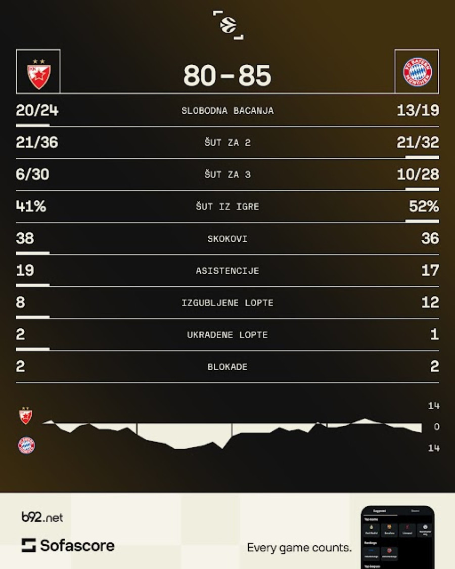 Crvena zvezda je sedma na tabeli sa 17 pobeda i 13 poraza, dok Bajern zauzima 15. mesto sa skorom 13-17.