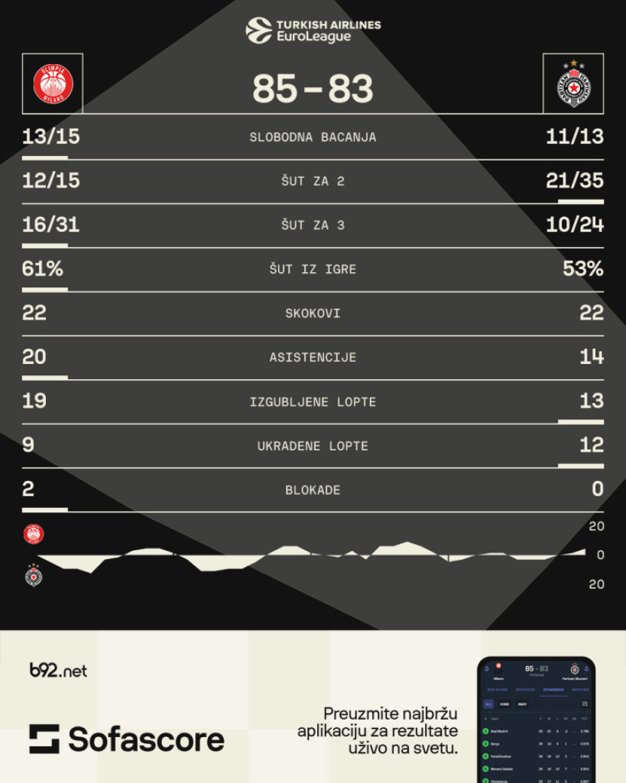 Najefikasniji kod Partizana bili su Aleksa Avramović sa 19, Bruno Kaboklo sa 13, Zek Ledej sa 12 i Danilo Anđušić sa 11 poena.