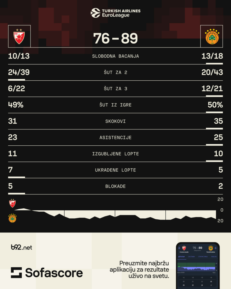 Crveno-beli su zabeležili šesti poraz u nizu, peti u međusobnim duelima sa gostima iz Atine, čime su ostali i bez matematičke šanse da se izbore za 10. mesto koje vodi u plej-in.