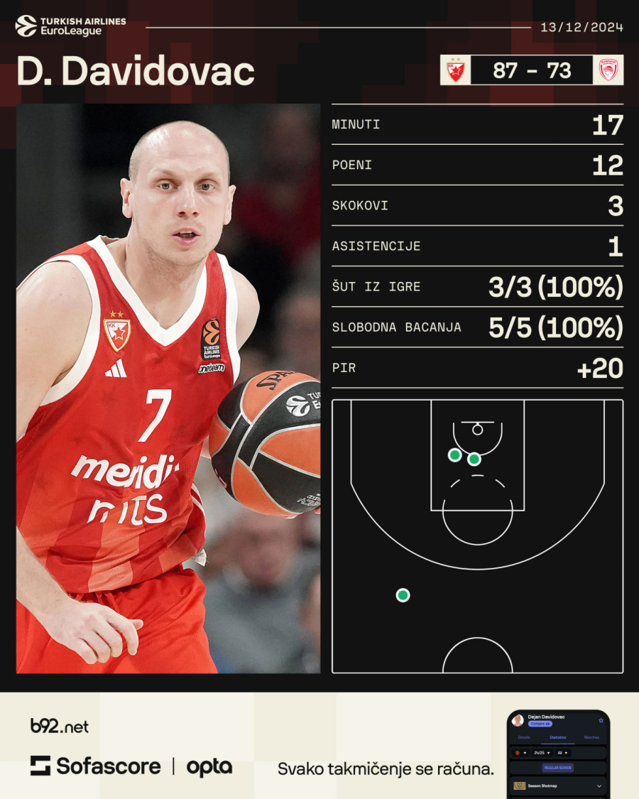 Spenser Dinvidi je odigrao najbolju utakmicu od dolaska u Bajern, postigao je 25 poena i bio najefikasniji pojedinac na meču.