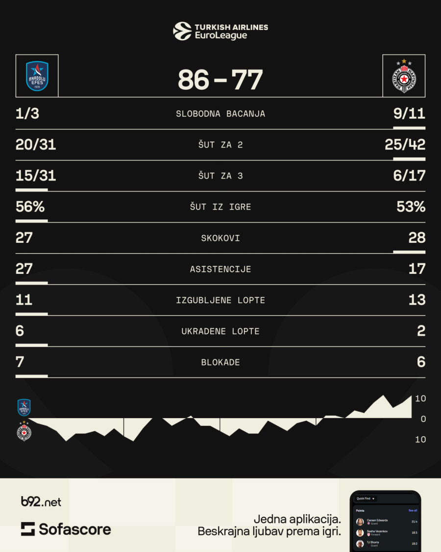 Osmani i Oturu iz blizine, a Larkin i Buboa sa distance su kaznili crno-bele. Buboa je sa tri vezane trojke razbio odbranu Partizana, a Efes je pobedio zasluženo 86:77.