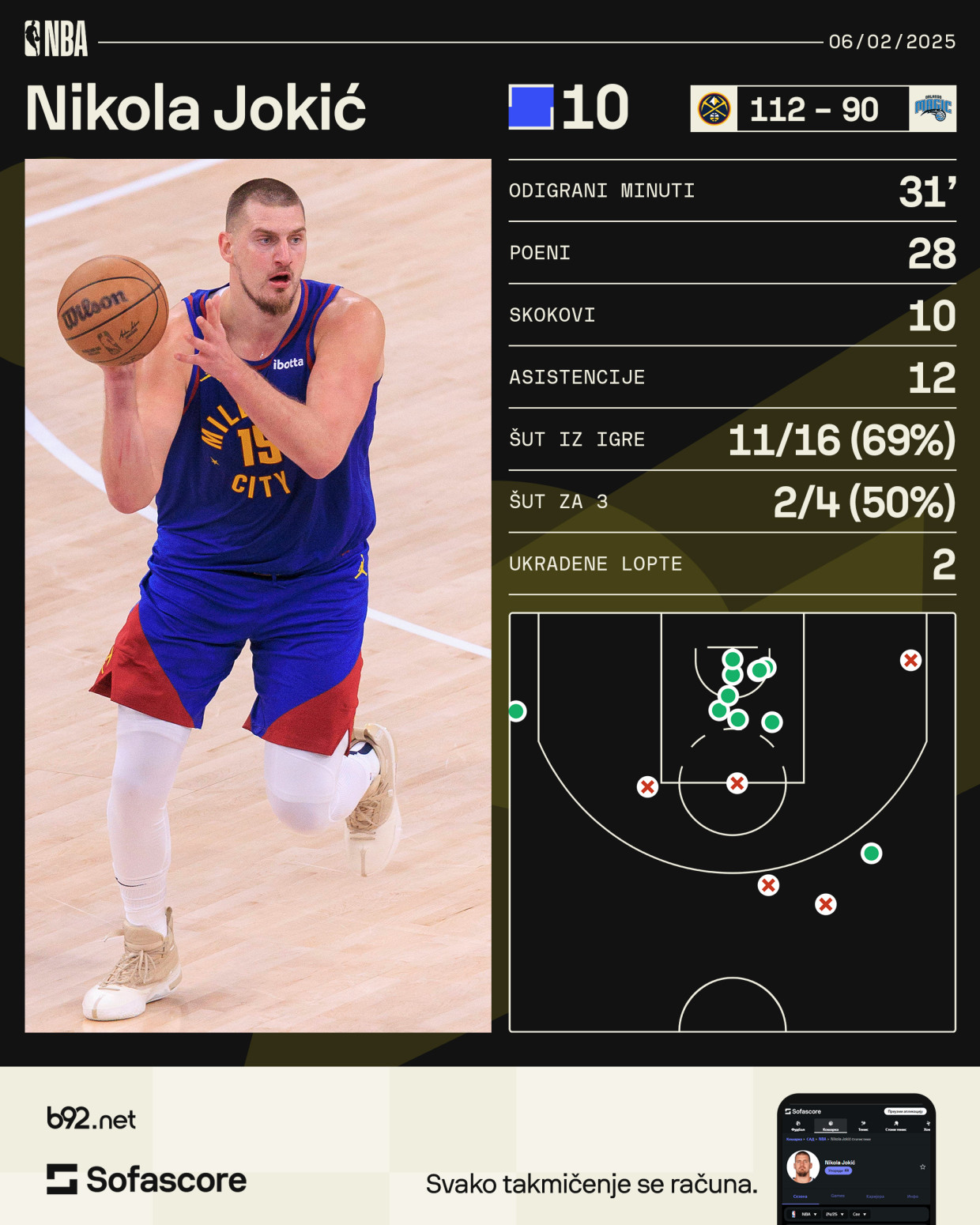 Nikola Jokić još jednom je odradio "dan u kancelariji", upisao tripl-dabl i predvodio Denver Nagetse do veoma ubedljive pobede nad Orlando Medžikom rezultatom 112:90.