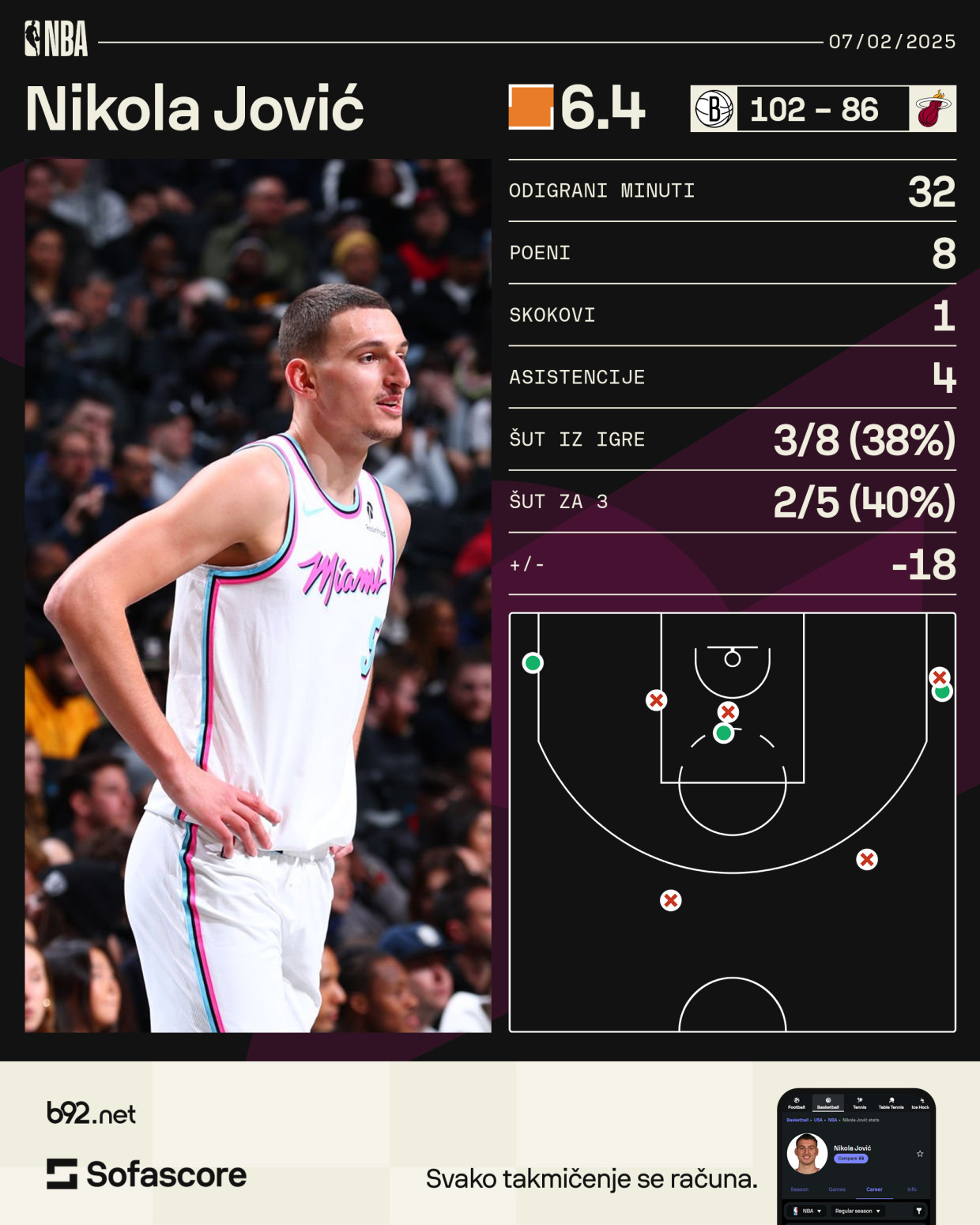 Srpski reprezentativac Nikola Jović nije imao najsjajnije veče, za 32 minuta je upisao osam poena uz šut iz igre 3/8, jedan skok i četiri asistencije.