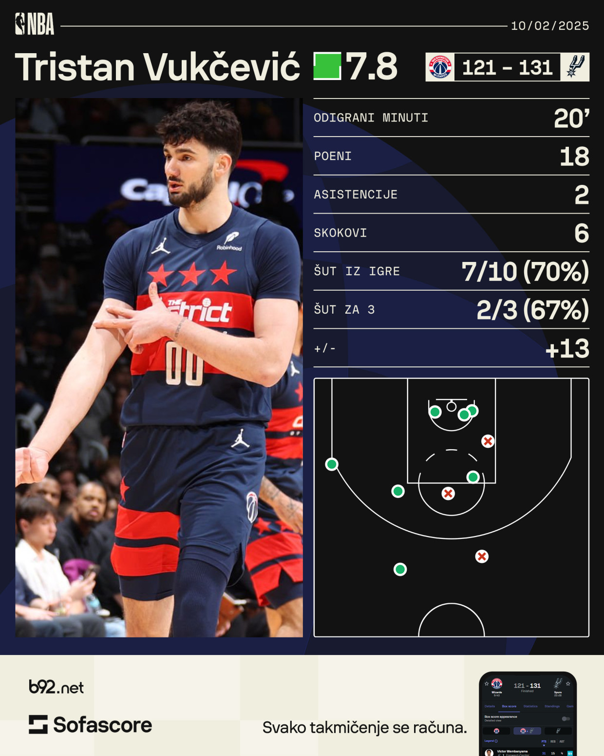 Srpski košarkaš Tristan Vukčević je blistao na parketu, ubacio je 18 poena (7/10 iz igre) uz šest skokova i dve asistencije.