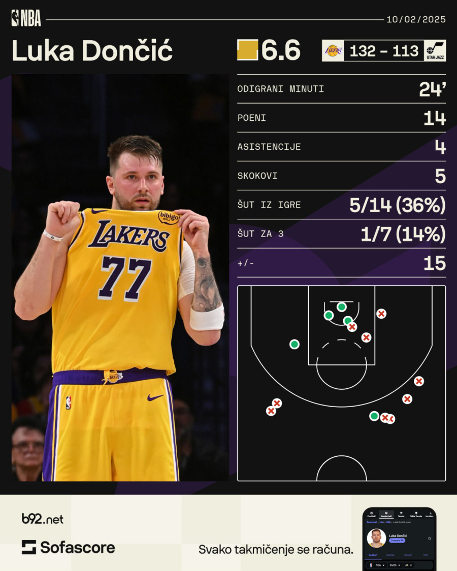 Dončićev prvi koš kao igrača Lejkersa bila je trojka u uvodnim minutima, ali je kasnije promašio svih preostalih šest pokušaja.