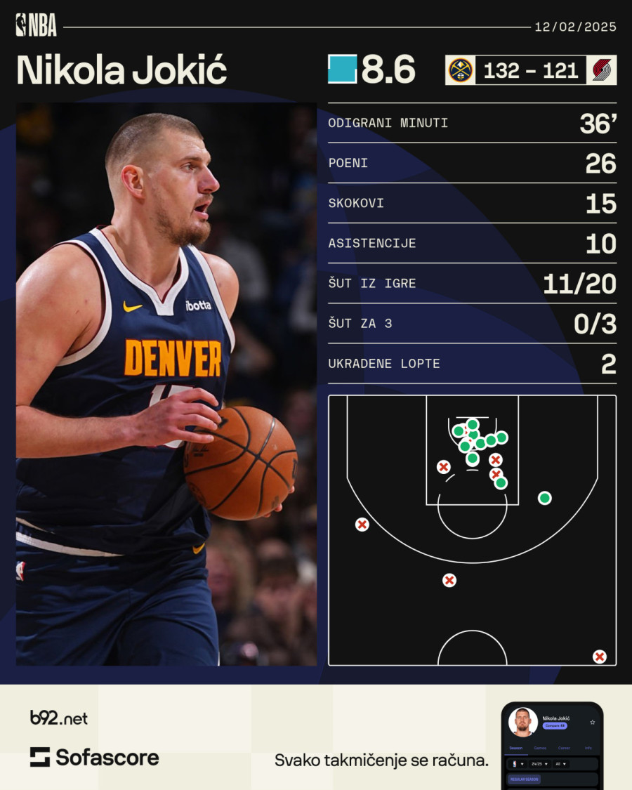 Jokić je radio bukvalno sve protiv Portlanda i postigao 26 poena uz 15 skokova i 10 asistencija.