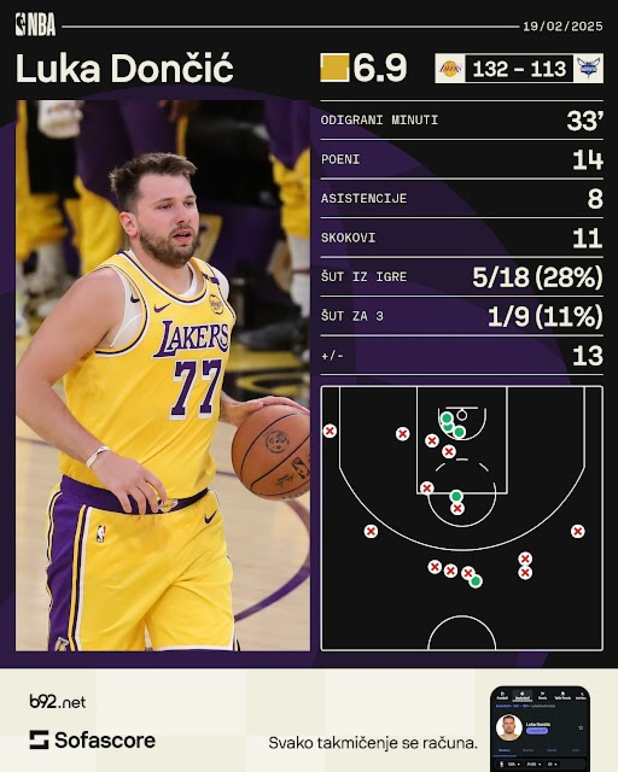 Šarlot će u narednoj utakmici igrati na gostujućem terenu protiv Denvera, za koji igra reprezentativac Srbije Nikola Jokić, dok će Lejkersi igrati u Portlandu protiv Trejlblejzersa.
