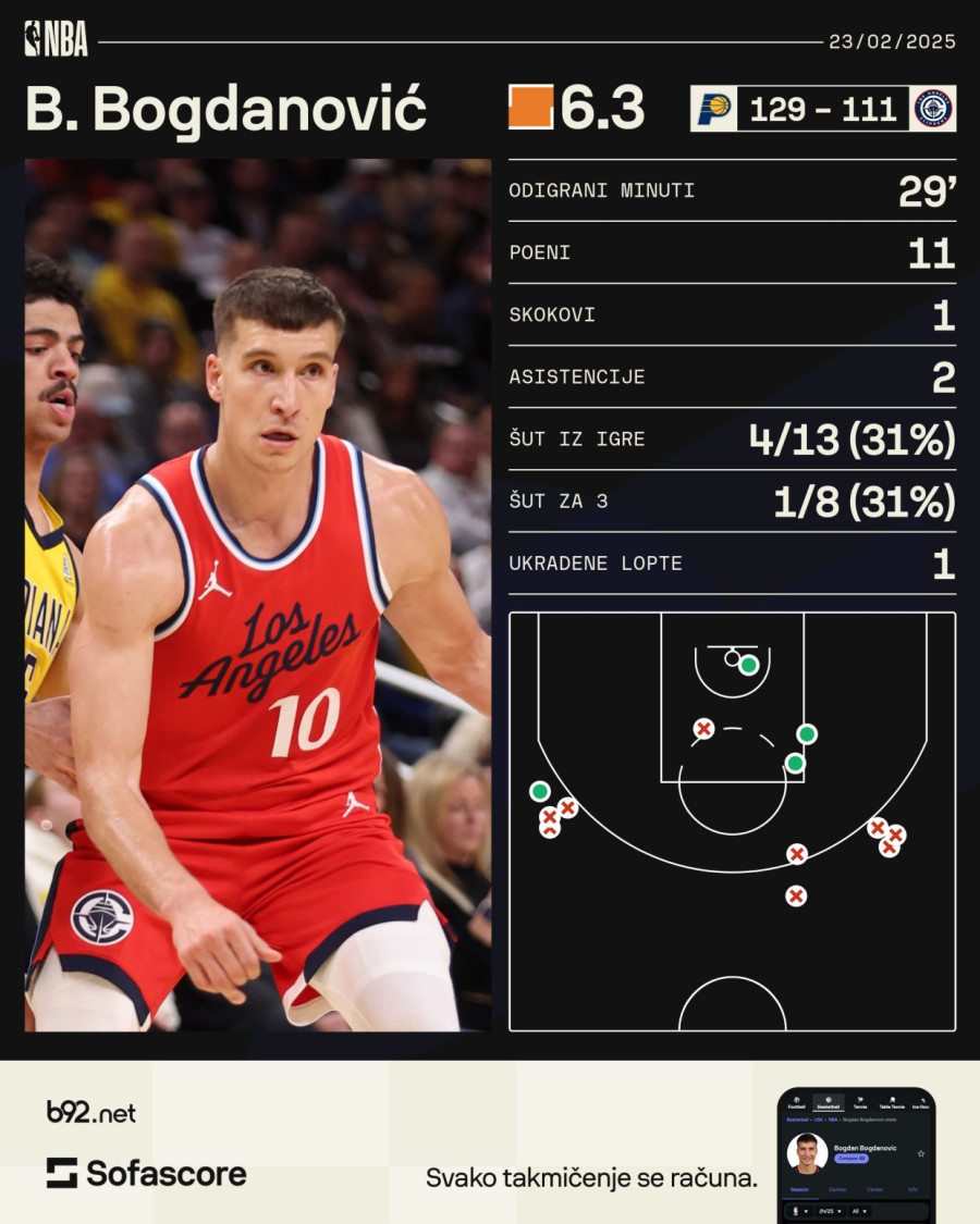 Kapiten reprezentacije Srbije Bogdan Bogdanović za 29 minuta igre zabeležio 11 poena (1/8 šut za tri poena), dve asistencije, skok i ukradenu loptu.