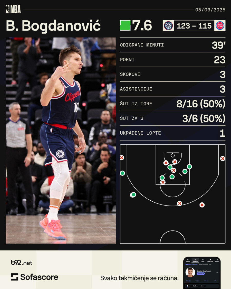 Za to vreme postigao je 23 poena uz solidan šut iz igre (3/6 za tri, 5/10 za dva), a bio je nepogrešiv sa linije slobodnih bacanja (4/4).
