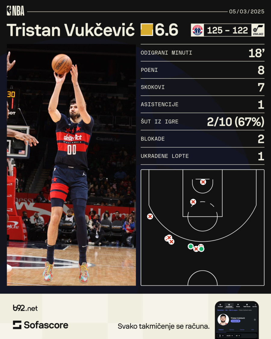 Njegova šuterska realizacija nije bila na najvišem nivou – pogodio je samo dve trojke iz osam pokušaja, oba šuta za dva poena su mu bila neprecizna, dok je sa linije penala bio stoprocentan (2/2).
