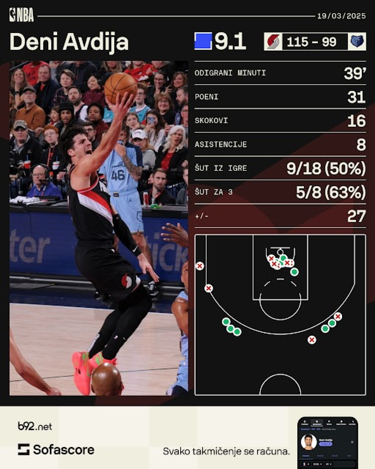 Bila je ovo 31. pobeda Portlanda, a najzaslužniji za ovaj trijumf  bio je Deni Avdija.