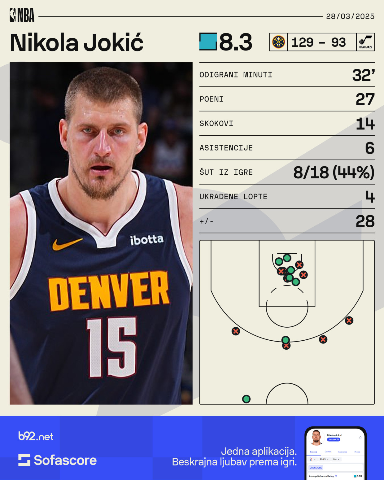 Jokić je odigrao tri četvritine utakmice i postigao  27 poena i 14 skokova uz šest asistencija, nakon čega ga je trener odmarao u poslednjoj deonici.