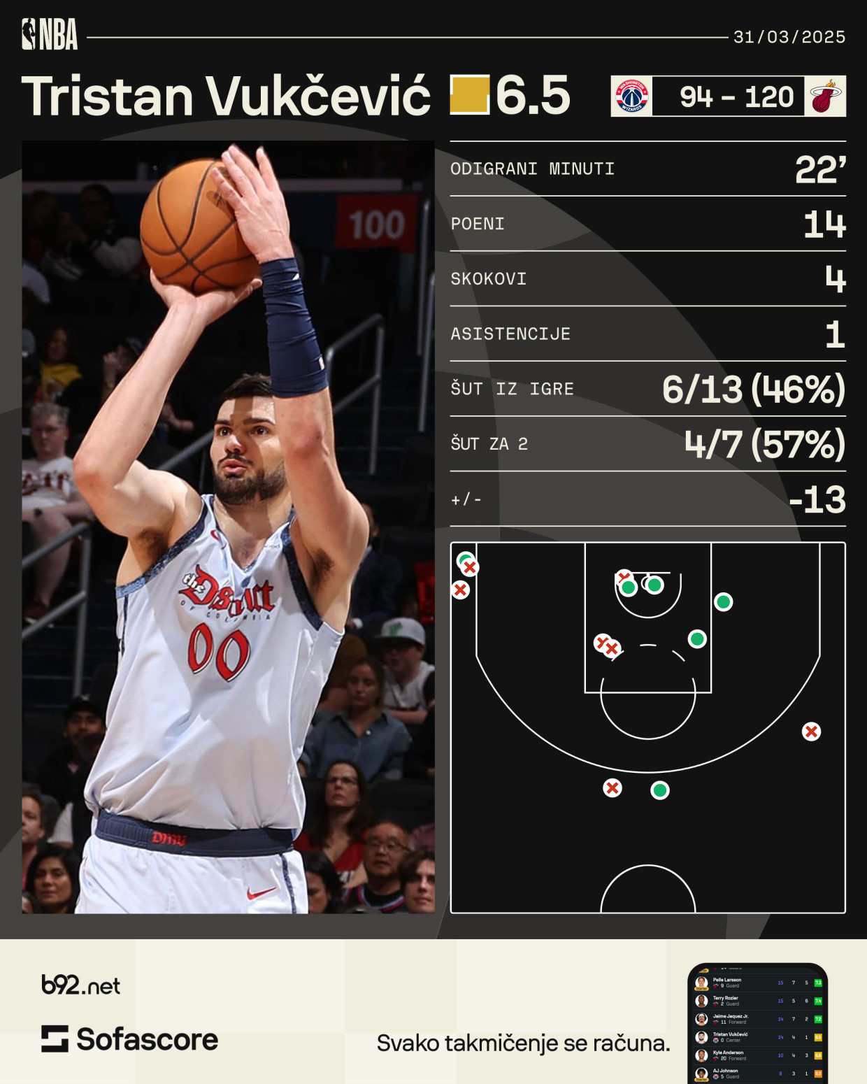 Kod Vašingtona je pored Vukčevića jedini dvocifren bio još Džordan Pul sa 35 poena, tri skoka i četiri asistencije.