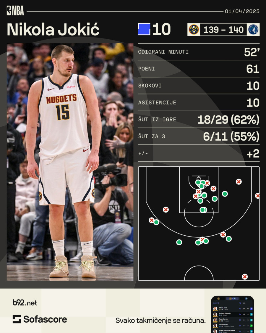 Jokić je za 52 minuta i 38 sekundi na parketušutirao 18/29 iz igre, od čega 6/11 za tri, uz 11 skokova i 10 asistencija.