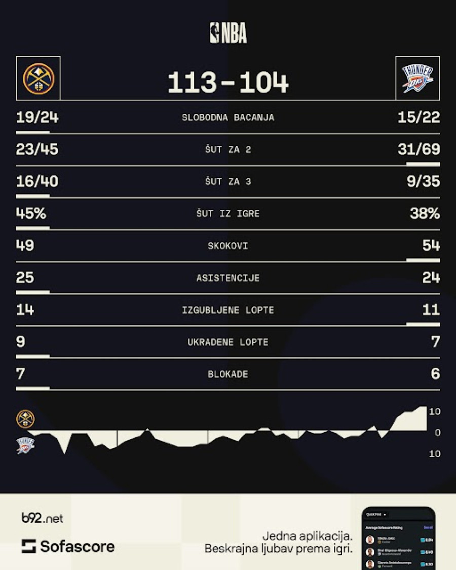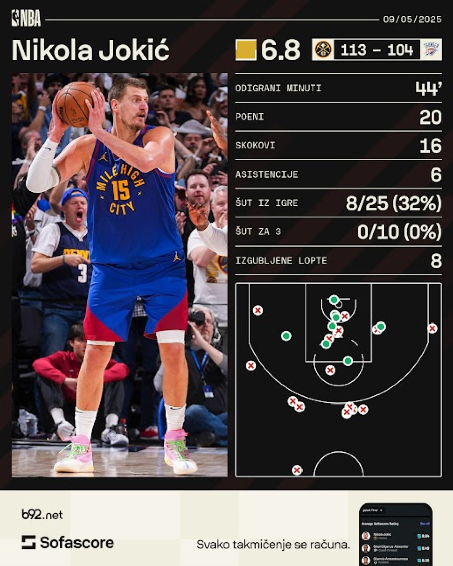 Tako da kako su igrali na kraju mogu biti zadovoljni što su na poluvremenu gubili sa svega pet poena razlike, jer je i Oklahoma mučila muku sa igrom u napadu, ali zato su u odbrani bili mnogo bolji i to najviše kako su brani Jokića, koji je imao dosta problema da dođe do poena.