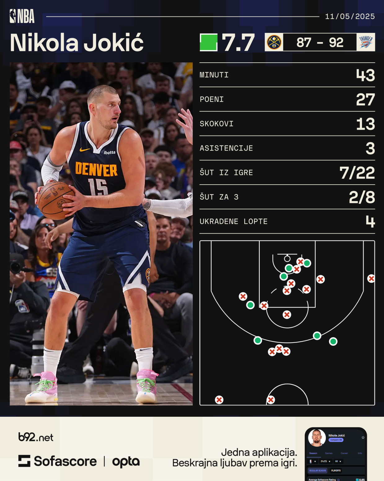 Na kraju je Jokić imao 27 poena, 13 skokova, 3 asistencije i 4 ukradene lopte. Iz igre je šutirao 7/22 što je tek 32% uspešnosti.