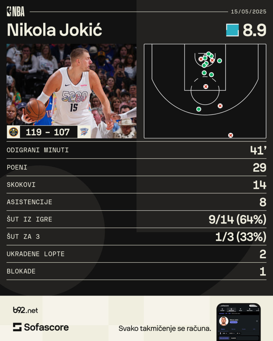Jokić je utakmicu završio sa 29 poena, 14 skokova i 8 asistencija i pohvalio saigrača Džulijana Strotera za 15 poena protiv Oklahome, ali i 8 u trećoj četvrtini, što je prelomilo meč.