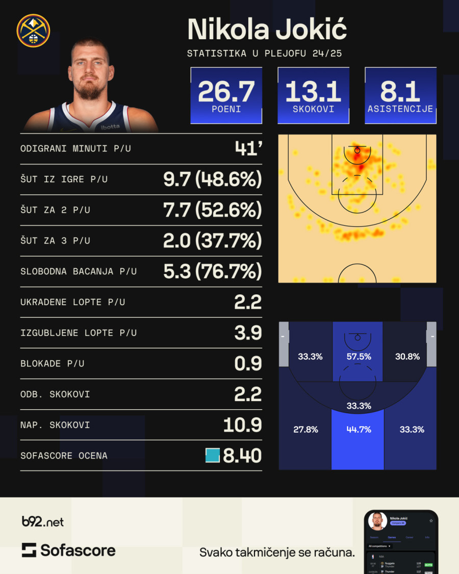 Jokićeva statistika bi bila znatno bolja kada se ne bi računalo njegovih pet "hivsa" u pomenuta tri meča, šest u seriji sa Tanderom i ukupno sedam u plej-ofu.
